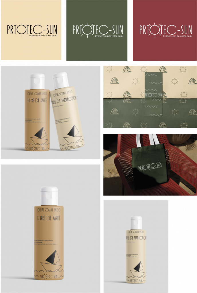 J’ai opté pour un design sobre et moderne. Le nom de marque Protec-Sun est écrit avec une typographie à la fois linéaire et arrondie, souvent associée à l’univers cosmétique. Cette typographie reflète à la fois simplicité et douceur, tout en évoquant une esthétique lumineuse.