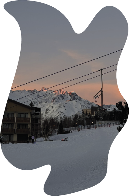 Sur la droite de l’image, un hôtel en bois, à l’architecture traditionnelle, s’intègre parfaitement dans l’environnement alpin. Ce bâtiment, discret mais chaleureux, contraste avec la pureté de la neige environnante. L’ensemble de la photo, avec la lumière dorée du coucher de soleil, met en valeur les textures de la neige, des arbres et des éléments architecturaux tout en offrant une vue typique des Alpes en fin de journée.